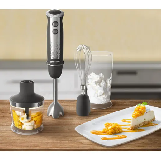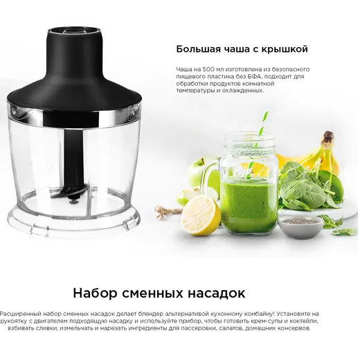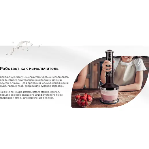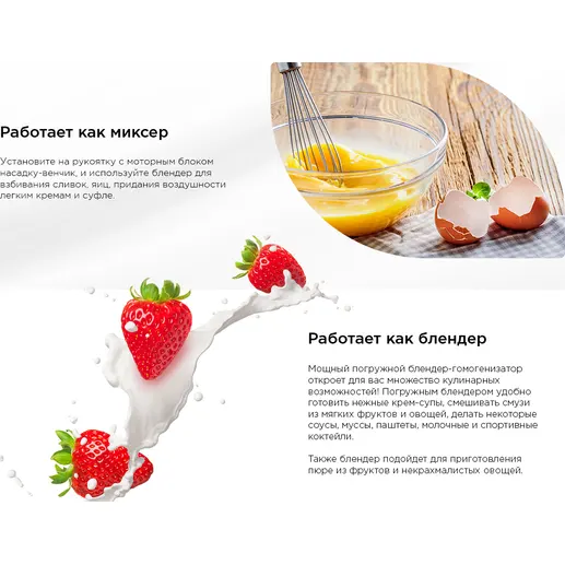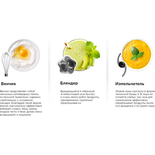 Легко меняйте насадки и готовьте с удовольствием: взбивайте нежные десерты и воздушные кремы, измельчайте сыр, нежирное мясо или овощи, готовьте крем-супы и натуральные соусы всего за несколько минут.