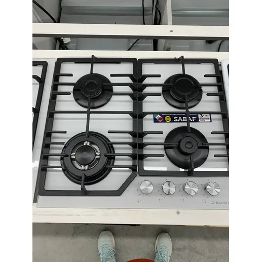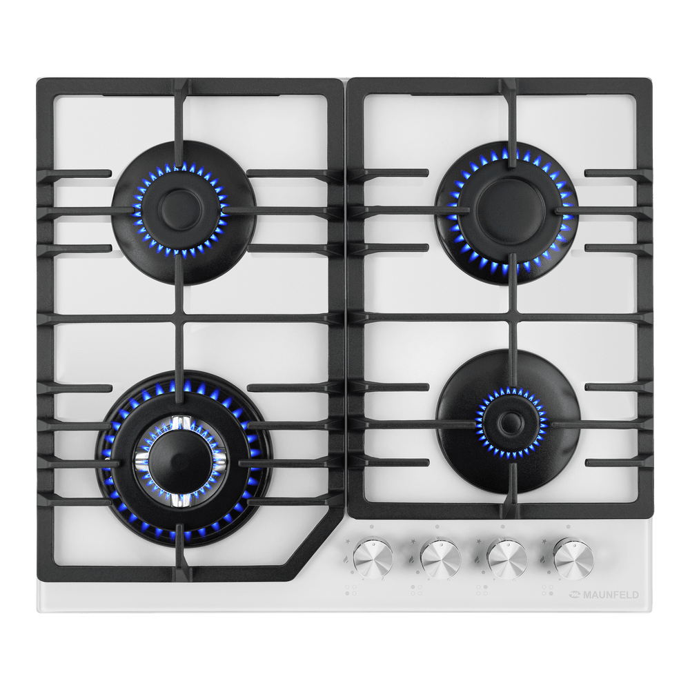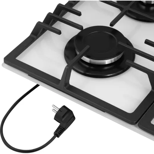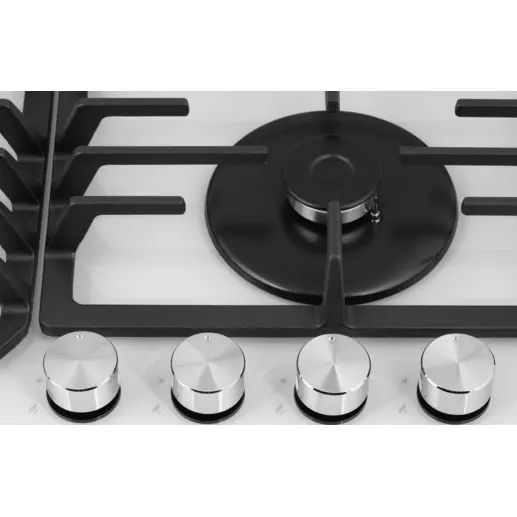Панель белого цвета выполнена из закаленного стекла, устойчивого к царапинам, сколам и постоянным перепадам температур. В данной модели установлены высококачественные итальянские горелки SABAF (4 конфорки). Три стандартные конфорки мощностью 1000 Вт, 1700 Вт, 1700 Вт и одна сверхмощная WOK-конфорка (3800 Вт) с двойным пламенем, спроектированные таким образом, что огонь не перегревает ни чугунные решетки, ни ручки управления.