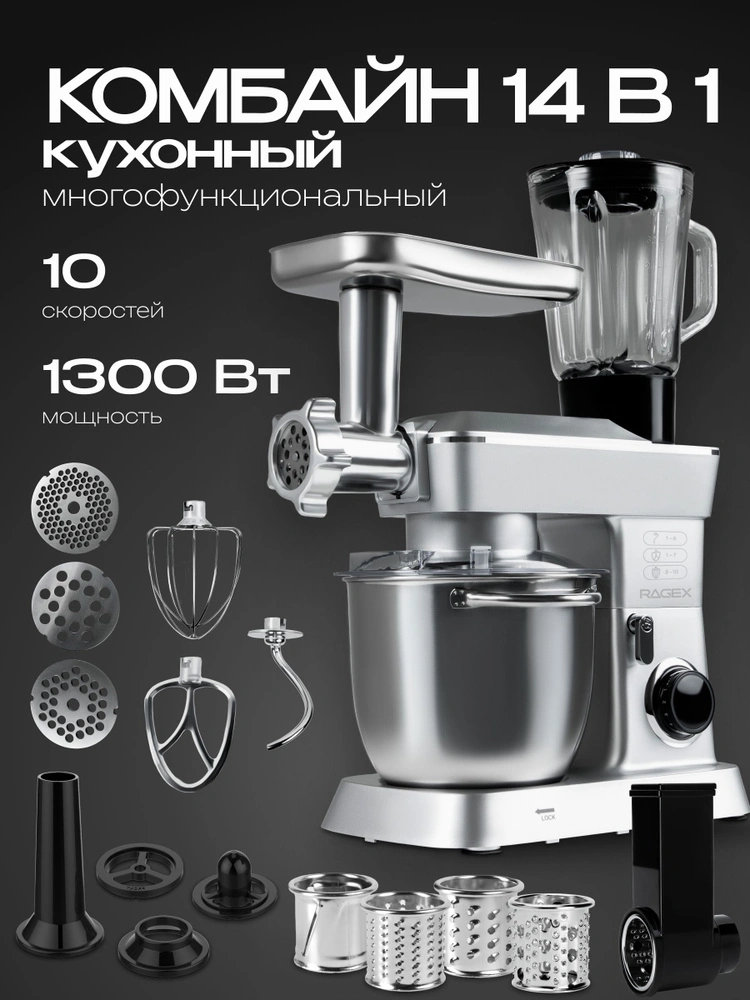 Кухонный комбайн 14 в 1 RAGEX R112, 4.5л, 1300Вт, цвет: 900 (серебрист