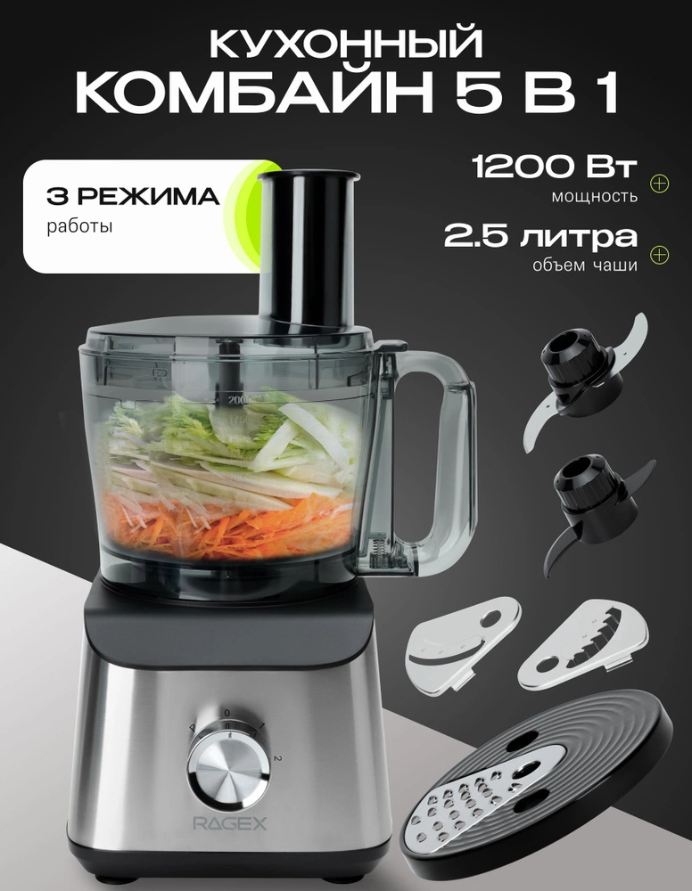 Кухонный комбайн 5 в 1 RAGEX R109, 2.5л, 1200Вт, цвет: 900 (серебристы