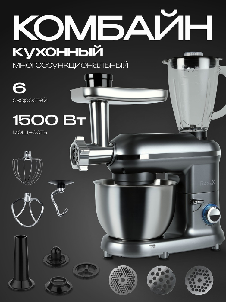 Описание лота: "Кухонный комбайн 9 в 1 RAGEX R101, 4.5л, 1500Вт, цвет: 200 (серый)"