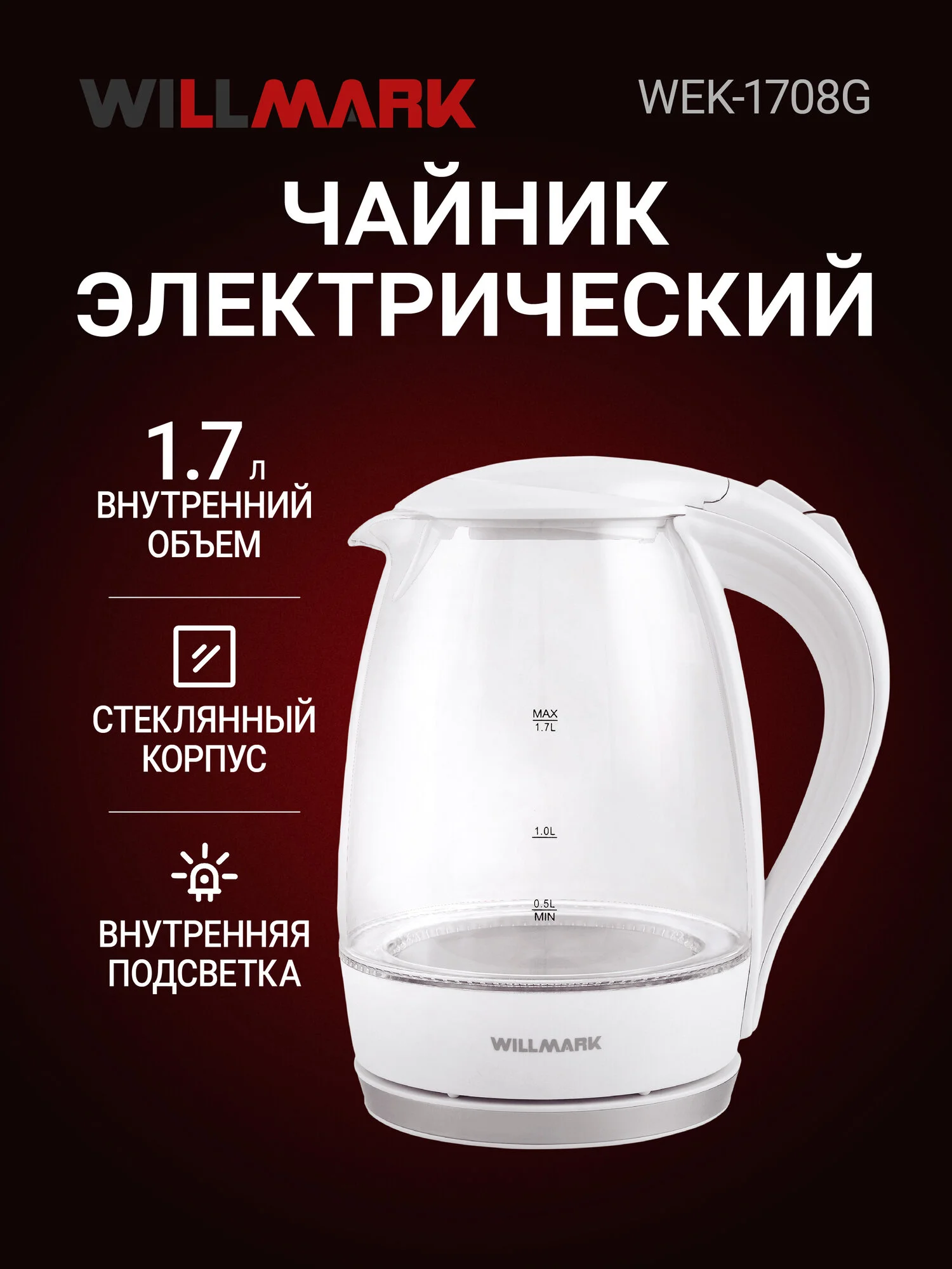 Описание лота: "Чайник эл. WILLMARK WEK-1708G (1.7л, пов. на 360 град., LED-подсв., ко"
