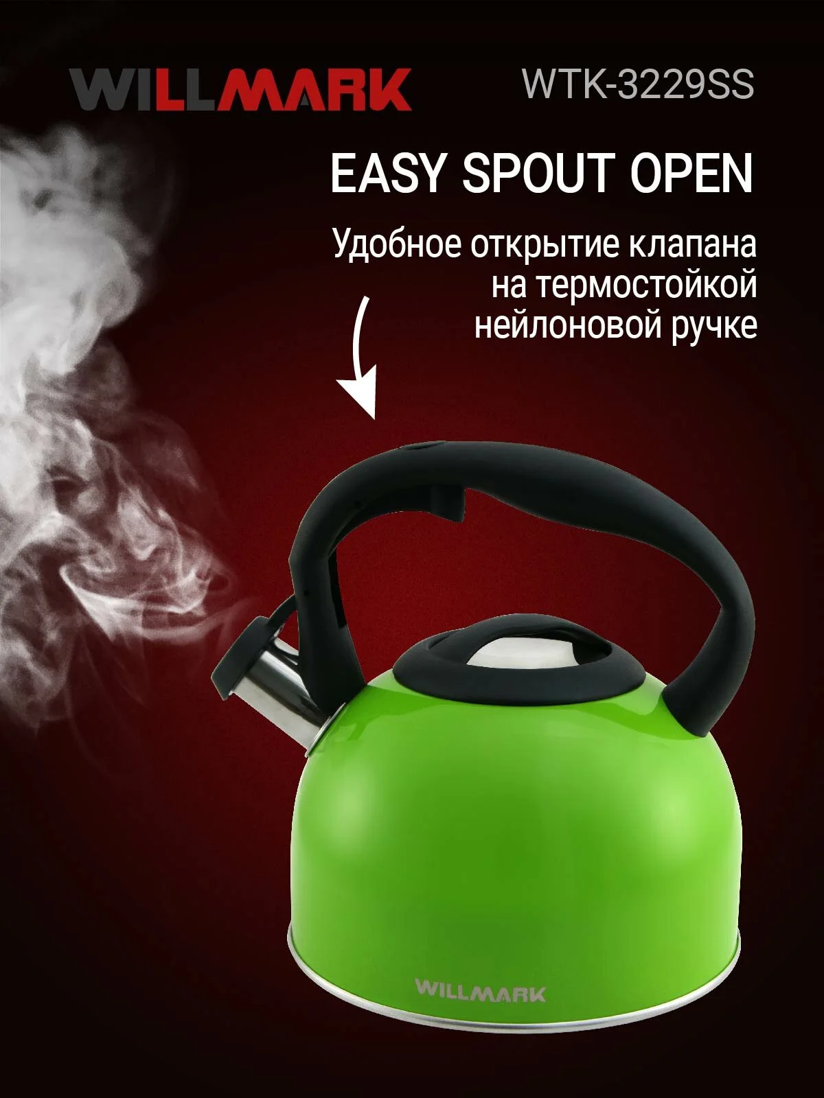 Описание лота: "Чайник WILLMARK WTK-3229SS (2,5л, со свистком, с крышкой, нейлоновая р"